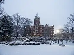 Tech's administrative buildings, such as Tech Tower, and the Bursar's Office, are also located on the Central Campus, in the recently renovated Georgia Tech Historic District.[69][70] The campus library, the John Lewis Student Center (formerly the Fred B. Wenn Building),[71][72] and the Student Services Building ("Flag Building") are also located on Central Campus. The Student Center provides a variety of recreational and social functions for students including: a computer lab, a game room ("Tech Rec"),[73] the Student Post Office, a music venue, a movie theater, the Food Court, plus meeting rooms for various clubs and organizations. Adjacent to the eastern entrance of the Student Center is the Kessler Campanile (which is referred to by students as "The Shaft").[74] The former Hightower Textile Engineering building was demolished in 2002 to create Yellow Jacket Park. More greenspace now occupies the area around the Kessler Campanile for a more aesthetically pleasing look, in accordance with the official Campus Master Plan.[75] In August 2011, the G. Wayne Clough Undergraduate Learning Commons opened next to the library and occupies part of the Yellow Jacket Park area.[76]