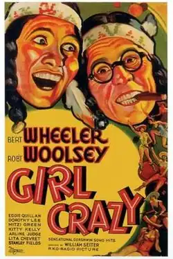 Girl Crazy is a 1932 American pre-Code musical film adaptation of the 1930 stage play of the same name. The film was very unlike the stage play except for its score. It was tailored for the comic talents of Wheeler & Woolsey, a popular comedy team of the time. Three songs written by George and Ira Gershwin for the play were retained: "Bidin' My Time", "I Got Rhythm", and "But Not for Me". According to RKO records, the film lost $150,000.[1] Lon Chaney Jr. appears in the film (uncredited) as a dancer in the chorus.[2]