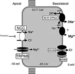 - ^ a b Franken GA, Adella A, Bindels RJ, de Baaij JH (February 2021). "Mechanisms coupling sodium and magnesium reabsorption in the distal convoluted tubule of the kidney". Acta Physiologica. 231 (2): e13528. doi:10.1111/apha.13528. PMC 7816272. PMID 32603001.