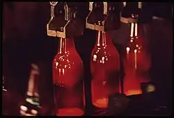 The container is then picked up from the mould by the "take-out" mechanism, and held over the "deadplate", where air cooling helps cool down the still-soft glass. Finally, the bottles are swept onto a conveyor by the "push out paddles" that have air pockets to keep the bottles standing after landing on the "deadplate"; they're now ready for annealing.