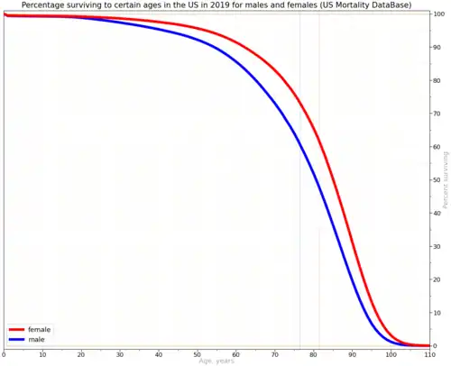 Percentage surviving to certain ages for males and females in the US in 2019[5] and in Japan in 2020[6]