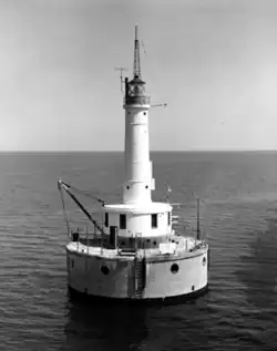 The light, situated about 9 miles (14 km) from the Fox River,[3][4][5][6] marks the west side of the entrance that leads to the city of Green Bay on the north side of the dredged shipping channel.[7] Federal funds were allocated in 1934 to replace the aging Peshtigo Reef Light with the Green Bay Harbor Entrance Light.[8][9] The work of constructing the light was started in 1935.[4][9]