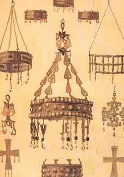 The Treasure of Guarrazar, Guadamur, Province of Toledo, Castile-La Mancha, Spain, is an archeological find composed of twenty-six votive crowns and gold crosses that had originally been offered to the Catholic Church by the Kings Visigoths in the seventh century in Hispania, as a gesture of the orthodoxy of their faith and their submission to the ecclesiastical hierarchy.[2] The most valuable of all is the votive crown of king Recceswinth with its blue sapphires from Sri Lanka and pendilia. Though the treasure is now divided and much has disappeared, it represents the best surviving group of Early Medieval Christian votive offerings.