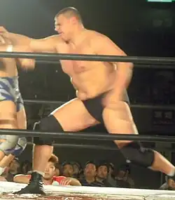 Hahn as Big Van Walter at a BJW show in May 2012, delivering a backhand chop to Yoshihito Sasaki
