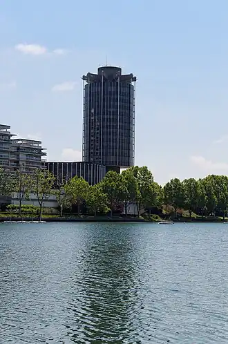 Following a substantial increase in the population, the town council decided to commission a more substantial town hall. The site they selected was on the east bank of the Lac de Créteil, a former quarry which had been rejuvenated as a large water feature.[6][7] Construction of the new building started in 1972. It was designed by Pierre Dufau in the modern style, built in steel and glass and was officially opened by the mayor, Pierre Billotte, on 5 December 1974.[8] The layout involved a four-storey drum-like structure, which accommodated the civic rooms, and an-11-storey circular tower, which accommodated the municipal offices and was 75 metres (246 ft) high. Internally, the principal rooms included the Salle du Conseil (council chamber) and the Salle des Mariages (wedding room).[9][10][11]