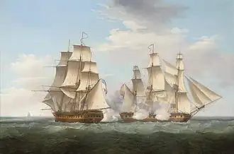 Ethalion entered service in 1797, operating in the English Channel as part of the Channel Fleet. Soon after commissioning in April under Captain George Countess, Ethalion was engaged in chasing a French squadron under Jean-Baptiste-François Bompart intent on invading Ireland during the Rebellion of 1798. Countess kept the French fleet in sight for several days and was able to signal for assistance. This brought a significant force under John Borlase Warren to the region and the French were defeated at the Battle of Tory Island. Ethalion, with Melampus, took the 40-gun Bellone, which the Royal Navy took into service. Ethalion had one man killed and three wounded; the French lost 20 men killed.[2] In 1847 the Battle of Tory Island earned for any still surviving crew members the Naval General Service Medal with clasp "12th October 1798".