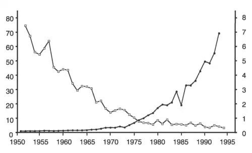 California Commercial White Abalone Haliotis sorenseni Landings for 1972–1992. The price exponentially increased as catch decreased.[6] Even taking fishing effort into account, the volume of abalone fished is inversely proportional to the price (power regression model, F40,2 = 139.96; p < 0.0001).[6]