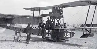 Umberto Calvello with personnel of 261st Squadron next to the wreckage of A91 shot down and captured on 4 May 1918