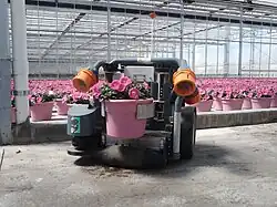 Harvest Automation’s first product is the OmniVeyor HV-100,[4] providing automated material handling for the nursery and greenhouse market. OmniVeyor HV-100 units are designed for operation in both indoor and outdoor environments as typically seen on wholesale greenhouses, hoop houses and nurseries. The robots are intended to reduce production costs and increase overall productivity.[5]
