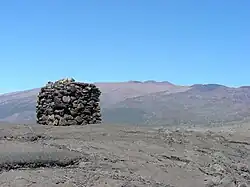 A Hawaiian kuahu (altar) near the junction of Saddle Road and Mauna Kea Access Road, Mauna Kea in the background