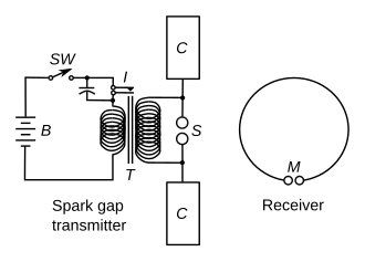 In the autumn of 1886, after Hertz received his professorship at Karlsruhe, he was experimenting with a pair of Riess spirals when he noticed that discharging a Leyden jar into one of these coils produced a spark in the other coil. With an idea on how to build an apparatus, Hertz now had a way to proceed with the "Berlin Prize" problem of 1879 on proving Maxwell's theory (although the actual prize had expired uncollected in 1882).[22][23] He used a dipole antenna consisting of two collinear one-meter wires with a spark gap between their inner ends, and zinc spheres attached to the outer ends for capacitance, as a radiator. The antenna was excited by pulses of high voltage of about 30 kilovolts applied between the two sides from a Ruhmkorff coil. He received the waves with a resonant single-loop antenna with a micrometer spark gap between the ends. This experiment produced and received what are now called radio waves in the very high frequency range.