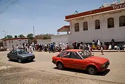 In the 1930s, the city map became the most important topic of discussion in the field of modern architecture. From the point of view of the international representatives of the New Building (Neues Bauen) Movement, cities had not yet adapted to the demands of the machine age. The architects and planners of this movement criticized the orderlessness of the cities and warned that the basic biological, psychological, and hygienic needs of the inhabitants were at risk.[50] To them, this lack of order in Asmara always meant that the plans for complete racial segregation had not yet been fully implemented. With the resettlement of the locals and the demolition of the Agdos and Hidmos, developers had gained additional room for growth in the middle of the 1930s. Italian architects were faced with a wealth of new, extensive building tasks. The designers of the New Building Movement deliberately broke away from the tradition of classical Italian architecture, but also from local African architecture.[27] In Asmara's historic city center, there is only one building that is recognizable as Eritrean architecture and as stemming from Eritrean culture.[51] It cannot be said that Asmara is a fusion of modern architecture and African highland culture,[52] as Edward Denison writes. Aram Mattioli finds much more critical words: "In Asmara, it was not a question of fusing together different cultures, and certainly not an aesthetic, creative reception of European-influenced modernism by African architects, but an imperial and racist societal experiment that used a modern design vocabulary."[53]