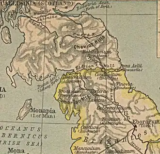 Conquests by Anglian invaders led to the establishment of the kingdoms of Deira and Bernicia. The first Anglian settlement was effected in 547 by Ida, who, accompanied by his six sons, pushed through the narrow strip of territory between the Cheviots and the sea, and set up a fortress at Bamburgh, which became the royal seat of the Bernician kings. About the end of the 6th century Bernicia was first united with the rival kingdom of Deira under the rule of Æthelfrith of Northumbria, and the district between the Humber and the Forth became known as the kingdom of Northumbria.[14]