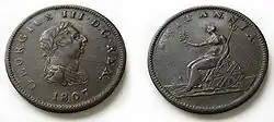 - 1806–1807. Weight 9.2–9.8 grams, diameter 29 millimetres. Obverse shows a right-facing bust of the king, with the inscription GEORGIVS III D G REX date, reverse shows a slightly different left-facing seated Britannia holding a spray and spear, with the inscription BRITANNIA.