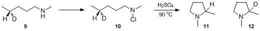 The reaction also has a quite large hydrogen isotope effect: in the decomposition of 10, the ratio of 1,2-dimethylpyrrolidine 11 and 1,2-dimethylpyrrolidine-2-d 12 (determined by combustion and IR spectra) suggests kHkD ≈ 3.42–3.54.