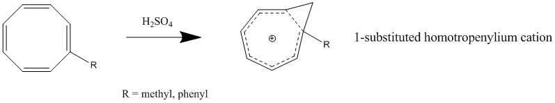 After initial reports of a "homoaromatic" structure for the tris-homocyclopropenyl cation were published by Winstein, many groups began to report observations of similar compounds. One of the best studied of these molecules is the homotropylium cation, the parent compound of which was first isolated as a stable salt by Pettit, et al. in 1962, when the group reacted cyclooctatraene with strong acids.[8] Much of the early evidence for homoaromaticity comes from observations of unusual NMR properties associated with this molecule.