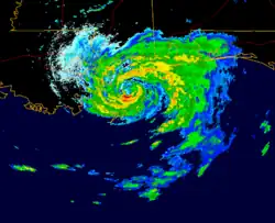 Heavy rain and winds buffeted many parishes located east of the city of New Orleans.[2][5] A small radius near the center of the storm had much of the extreme rainfall, and limited the flooding, which could have been disastrous if it were widespread.[2][7] Grand Isle and portions of the lower Plaquemines Parish were the worst hit in Louisiana. Additionally, Grand Isle reported a wind gust of 100 mph (160 km/h) and a storm surge of 5.2 feet (1.6 m).[7] At New Orleans International Airport, sustained winds of 28 mph (45 km/h) and gusts of 33 mph (53 km/h) were reported on July 19.[8] A gauge reported a water level of 4.85 feet (1.48 m) in Venice. Storm tides were 2 to 3 feet (0.61 to 0.91 meters) above normal on average.[7]