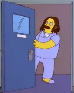 A caricature of John Swartzwelder can be seen shutting the door of a room in Calmwood Mental Hospital.[3] Later in the episode, during the scene where the townsfolk are welcoming Ned back, someone can be seen holding a sign that says "Free John Swartzwelder".[4] During the sequence where Flanders yells at the town, a man with a ponytail and wearing a white shirt who is a caricature of Bob Anderson can be seen.[5]