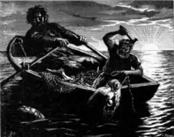 Hymiskviða also recounts Thor's fishing for Jörmungandr, the Midgard serpent.[4] Thor goes fishing with Hymir, using the head of Hymir's best ox for bait, and catches Jörmungandr, who then either breaks loose[5] or, as told in the Gylfaginning of the Prose Edda, is cut loose by Hymir.[6] The Prose Edda provides the additional detail that while Thor was attempting to pull Jörmungandr in, his feet went through the bottom of the boat.[6]