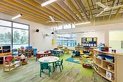 The Ampang campus, which began use from August 2018, is set on approximately 10 hectares (25.7 acres) in Ampang Hilir.[26] The campus has facilities catering to both athletics and the arts. Athletic facilities include: an indoor fitness center, an Olympic-sized track; three sports fields; an Aquatic Complex including a 50-metre Olympic-sized swimming pool built accredited by FINA,[27] two gyms, an indoor climbing wall, tennis courts and playgrounds.[28][29] Arts facilities include The Dr. Norma J. Hudson Amphitheater, the Robert B. Gaw Theater and the Melawati Theater: available for student meetings, music recitals, presentations, plays and other arts-centric performances;[30][31] ISKL's 'green' facility is the first International school in Malaysia to achieve platinum Green Building Index (GBI) status with environmentally sustainable concepts.[32][33]