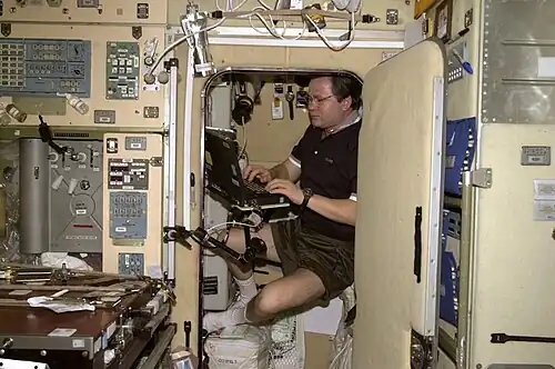 The ISS crew provides opportunities for students on Earth by running student-developed experiments, making educational demonstrations, allowing for student participation in classroom versions of ISS experiments, and directly engaging students using radio, and email.[63][64] ESA offers a wide range of free teaching materials that can be downloaded for use in classrooms.[65] In one lesson, students can navigate a 3D model of the interior and exterior of the ISS, and face spontaneous challenges to solve in real time.[66]
