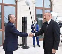 Representatives of countries, including Argentina,[66] Canada,[67] Chile,[68] China,[69] Croatia,[70] Estonia,[71][72] France,[73][74][75] Georgia,[76] Germany,[26] Greece,[77] India,[78][79] Indonesia,[80] Iran,[81][82][83] Kazakhstan,[84] Latvia,[85][86] Lithuania,[87][86] Moldova,[88] Poland,[89] Romania,[90][91] Russia,[74][75][92] Saudi Arabia,[93] the United Kingdom,[94] the United States,[74][75][95] Uruguay,[96] and the Holy See,[26] have called for a peaceful resolution to the conflict. Afghanistan called for an end to Armenian occupation in Nagorno-Karabakh while calling for a cease-fire, urging the parties involved to resolve the long-standing crisis peacefully.[97] Bosniak member of the Presidency of Bosnia and Herzegovina Šefik Džaferović and the leader of the Party of Democratic Action, Bakir Izetbegović, voiced support for Azerbaijan, condemning Armenia and comparing the situation with the 1992–1995 Bosnian War.[98][99] Cyprus condemned Azerbaijan for breaching the ceasefire and for any escalating actions, calling for a return to peaceful negotiations.[100] After the war, in January 2021, the Ambassador of the United Kingdom to Azerbaijan James L. Sharp, congratulated the Azerbaijani people on their country's victory in the war.[101][102]