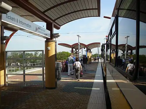 Inwood/Love Field station is a DART light rail station in Dallas, Texas. The elevated station is located at the intersection of Inwood Road and Denton Drive in the western end of the Oak Lawn neighborhood. The station is served by the Green Line and the Orange Line.[1]