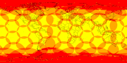 Coverage of Earth by the Iridium satellites, which are arranged in 6 orbits of 11 satellites each. Animation shows approximately 10 minutes.
