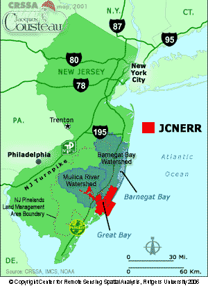 The Jacques Cousteau National Estuarine Research Reserve, located in southeastern New Jersey, encompasses over 116,116 acres (nearly 470 km2) of terrestrial, wetland and aquatic habitats within the Mullica River-Great Bay ecosystem.[1]