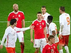 Collins was given his debut captain's armband for a friendly against Sweden on 3 March 2010.[45] On 7 September 2012, in a 2014 World Cup qualifying game against Belgium, he was given a straight red card for a two-footed lunge on Guillaume Gillet, Wales went on to lose the match 2–0.[46] Collins was included in the Wales 23-man squad for Euro 2016.[47] Having made 51 appearances for Wales, Collins announced his international retirement in November 2017.[48]