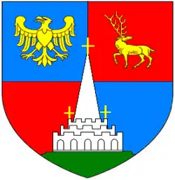 1. ^ Arms as depicted in a 1794 stained glass image in Shute Church of the arms of George Templer of Shapwick. These differ in several details from the official grant of 1765 registered in the College of Arms: Quarterly azure and gules, on a mount in base vert the perspective of an antique temple argent of three stories, each embattled; from the second battlement two steeples, [sic] and from the top, one, each ending in a cross sable [sic] on the pinnacle; in the first quarter an eagle displayed; in the second a stag trippant regardant or.[1]