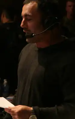 After the UFC was taken over by Zuffa in 2001, Rogan attended some events and became friends with its new president Dana White, who offered him a job as a color commentator. However, Rogan initially declined as he "just wanted to go to the fights and drink".[39][12] In 2002, White was able to hire Rogan for free in exchange for prime event tickets for him and his friends.[38] After about 15 free gigs as a commentator, Rogan accepted pay for the job, working alongside Mike Goldberg until the end of 2016.[12] Rogan won the Wrestling Observer Newsletter Award for Best Television Announcer twice, and was named MMA Personality of the Year four times by the World MMA Awards.[41]