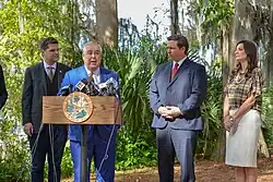 Morgan speaking alongside Governor Ron DeSantis, Lieutenant Governor Jeanette Nuñez, and Congressman Matt Gaetz during the announcement of the legalization of medical cannabis in Florida, 2019