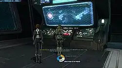 Players' choices permanently open or close storylines and affect players' non-player character (NPC) companions.[20] It is intended that the game should provide more context for characters' missions than any previous MMORPG. Every character in the game, including the player character, features full voice dialog to enhance gameplay, and interactions feature a dialogue system similar to that used in the Mass Effect series.[20] Players are able to choose from a variety of NPCs, although spending time with a single companion will help more in developing story and content than dividing time among several,[25] and may even develop a love interest.[26] It is possible for players to "blow it big time" if they fail to meet NPCs' expectations.[25] Players also have access to several planets,[20] including Korriban, Ord Mantell, Nal Hutta, Tython,[27] Coruscant, Balmorra, Alderaan, Tatooine, Dromund Kaas, Taris, Belsavis, Voss, Hoth, Corellia, Ilum, and Quesh, and the moon Nar Shaddaa. The planet Makeb was added in Patch 2.0, along with the Rise of the Hutt Cartel expansion pack.[28]