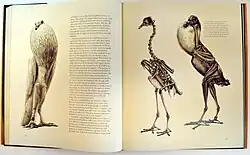 A double page spread from Unnatural Selection showing a domesticated pouter pigeon with its crop inflated in its courtship posture. According to the author's autobiographical public lecture A Very Fine Swan Indeed: Art, Science and 'The Unfeathered Bird', the musculature drawing was achieved by inserting a condom into the throat of the dead pigeon and blowing into it!