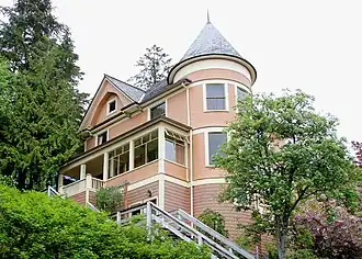 Looking down Creek Street, immediately outside of Ketchikan's downtown near the mouth of Ketchikan Creek. Creek Street, along with a block of Fourth Avenue in Fairbanks, were Alaska's two significant red-light districts until the passage of the Anti-Crib Laws in the early 1950s.
