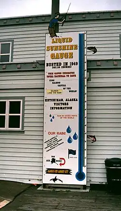 Ketchikan's Liquid Sunshine Gauge. The town experienced record annual rainfall in 1949, with 202.55 inches or 5,145 millimetres measured.