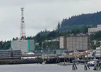 The West End (or Westend), located in the valleys of Carlanna and Hoadley creeks and across Tongass Narrows from Ketchikan International Airport, is Ketchikan's largest commercial and residential area. Shown are the city's tallest buildings, the Marine View Building and Tongass Towers. Ketchikan High School is partially visible at upper right.