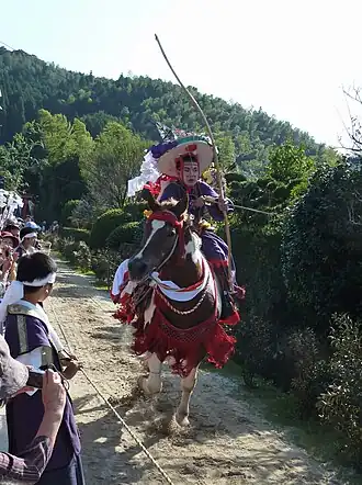 Kimotsuki has two town mascots (see yuru-chara) created by the Kimotsuki Tourism Association. Both wear purple outfits based on the traditional costume of the Yabusame Festival archer and have satellite heads. They generally make appearances at town sanctioned events.