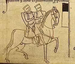 Depiction of two Templars seated on a horse (emphasising poverty), with Beauséant, the "sacred banner" (or gonfanon) of the Templars, argent a chief sable (Matthew Paris, c. 1250)[110]