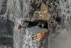 A jeep track runs down to the sea from Krýsuvík and Route 427. It ends at the high cliffs of Krýsuvíkurbjarg [ˈkʰriːsʏˌviːkʏrˌpjark] or Krýsuvíkurberg [-ˌpɛrk] which are renowned as bird cliffs with thousands of Icelandic sea birds like arctic terns, puffins, fulmars and more.[3] About 63,000 pairs of birds were counted there shortly before 2014. But the cliffs, which can be reached on foot, are also a window in the geologic past.[10] The lava flows covering the area came mostly from the crater up on Geitahlíð tuya, not from the Krýsuvík, but from the neighbouring Brennisteinsfjöll volcanic system. The area is protected as part of Reykjanesfólkvangur.[11]