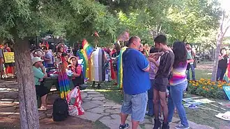 In June 2019, the 7th İzmir Pride, the 3rd Antalya Pride and the 27th Istanbul pride were banned by the cities' governors.[67][68][69] Amnesty International last week called for Turkey to lift the Pride bans. However, days later a court suspended İzmir pride week ban.[70] That same month, Turkish police dispersed a crowd gathered in the city of İzmir for a public press statement over the governorate's pride parade ban and detained 17 people, after the group read their press statement.[71][72]