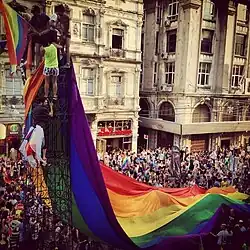 In 2003, Turkey became the first Muslim-majority country in which a gay pride march was held.[16] In Istanbul (since 2003) and in Ankara (since 2008) gay marches were being held each year with an increasing numbers of participation until 2015.[17] The gay pride march in Istanbul started with 30 people in 2003, and in 2010, there were 5,000. The pride parades in 2011 and 2012 were attended by more than 15,000 participants.