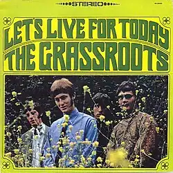 Let's Live for Today is the second studio album by the American rock band the Grass Roots, released in July 1967 by Dunhill Records. A new group was brought in for this album which included Creed Bratton, Rick Coonce, Warren Entner and Rob Grill. It features their first top-ten hit by the same name, "Let's Live for Today". The bulk of the compositions are by group creators Sloan and Barri, but the new group was allowed to compose four songs and was given some input in the studio instrumentation. The other A and B side singles released were "Depressed Feeling" (Non-LP B-side of "Let's Live for Today"), "Things I Should Have Said" b/w "Tip of My Tongue", and "Wake Up, Wake Up" b/w "No Exit". The album charted at No. 75.[4]