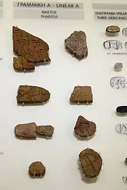 Linear A is a writing system that was used by the Minoans of Crete from 1800 BC to 1450 BC. Linear A was the primary script used in palace and religious writings of the Minoan civilization. It evolved into Linear B, which was used by the Mycenaeans to write an early form of Greek. It was discovered by the archaeologist Sir Arthur Evans in 1900. No texts in Linear A have yet been deciphered. Evans named the script "Linear" because its characters consisted simply of lines inscribed in clay, in contrast to the more pictographic characters in Cretan hieroglyphs – likewise undeciphered – that were used during the same period.[3]