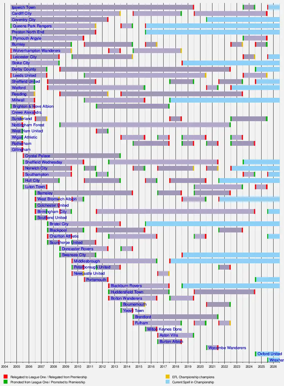 EFL Championship teams confirmed to be playing in the 2025–26 EFL Championship season are indicated in bold. If the longest spell is the current spell, this is indicated in bold, and if the highest finish is that of the most recent season, this is also in bold. A total of 58 teams have played in the Championship.