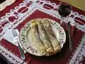 Literally "bread with a fur jacket", a savoury French toast or Gypsy toast or bread fritter, a breakfast food or sometimes as a side dish.