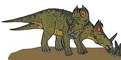 • Stygimoloch spinifer: Had a short skull dome with long horns jutting out from behind it. It is usually thought to be a subadult Pachycephalosaurus, but has been noted to be stratigraphically younger. Three attributed specimens recovered from the Ferris Formation, which is the taxon's southernmost occurrence, would make it distinct from the aforementioned genus.