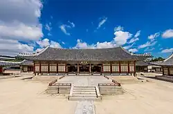 The main hall[b] of the palace[73] and a designated National Treasure.[71] It was used for major events like ceremonies and the issuing of edicts.[74] It was completed in 1395.[66][21][75] Five kings were coronated here, including Sejong in 1418.[74] It was destroyed in 1592 and reconstructed in 1867. It has remained in much the same form to the present.[76] It is the largest main hall of all Joseon palaces and is regarded as examplary of late-Joseon architecture. Like other Joseon main halls, it has a wŏltae in front used for ceremonies.[76]