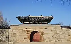 The east gate.[39] It was named in 1426.[40][41][30] It was repaired in 1428.[40] After being destroyed in 1592, it was rebuilt in 1865. It was originally only meant for use by civil servants.[39][42] However, during the colonial period and around the time of the construction of the Government-General of Chōsen Building, it became used as the main gate of the palace.[42] It is mostly identical in form to Yeongchumun.[39]